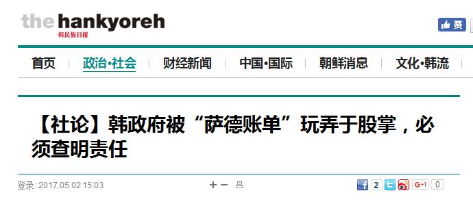 【環(huán)球網(wǎng)綜合報(bào)道】日前,美韓圍繞著部署“薩德”的費(fèi)用互相指責(zé),令世界“大跌眼鏡”。對(duì)此,韓國(guó)《韓民族日?qǐng)?bào)》5月2日發(fā)表題為“韓政府被‘薩德賬單’玩弄于股掌,必須查明責(zé)任”的社論稱(chēng),韓國(guó)在挨了美國(guó)背后一擊后,依然被美國(guó)牽著鼻子,未能作出妥善反應(yīng),只能苦苦掙扎...韓國(guó)政府竟然淪落到如此令人恥笑的地步,使人不禁感到憤慨!凹热皇虑橐呀(jīng)發(fā)展至此,韓國(guó)就應(yīng)該展開(kāi)國(guó)政調(diào)查,查明薩德部署過(guò)程的詳細(xì)始末,切實(shí)追究責(zé)任”。