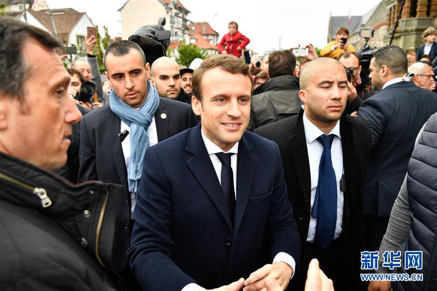 5月7日,在法國勒圖凱,“前進”運動候選人埃馬紐埃爾·馬克龍(中)抵達投票站。 新華社記者陳益宸 攝