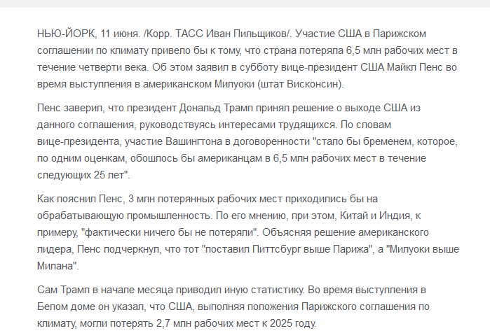 【環(huán)球網(wǎng)報道 記者 朱佩】美國總統(tǒng)特朗普此前表示,美國退出《巴黎氣候協(xié)定》,并將就在這一領(lǐng)域的新協(xié)議展開談判。對于退出該協(xié)定,美國政界人士持不同觀點(diǎn)。其中美國副總統(tǒng)邁克 彭斯表示,美國因加入《巴黎氣候協(xié)定》可能會失去650萬個工作崗位。