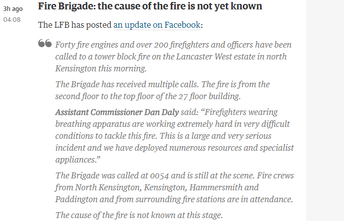 倫敦消防局2小時前在社交網(wǎng)站“推特”上發(fā)布的一張照片顯示,大樓的一面已經(jīng)被火焰吞噬。而消防局更早發(fā)布的消息稱,起火原因還未查明。