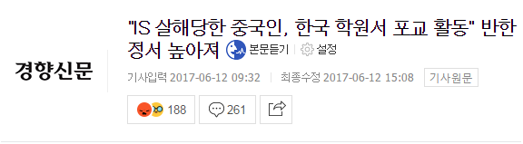 韓國《京鄉(xiāng)新聞》報道稱,被IS殺害的中國人被證實通過韓國人開設(shè)的學校進行傳教活動,中國網(wǎng)絡上反韓情緒再度高漲。
