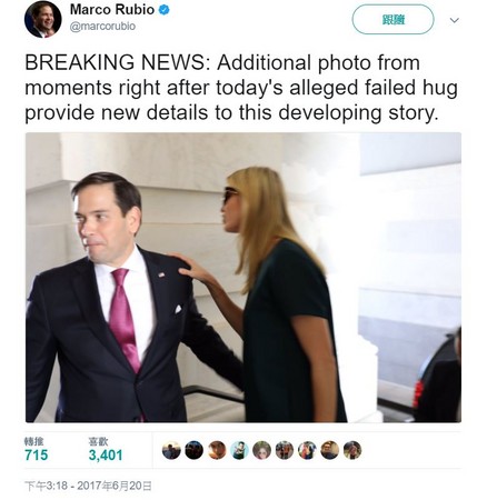 伊萬(wàn)卡身兼“第一女兒”和總統(tǒng)顧問(wèn),當(dāng)天赴國(guó)會(huì)山莊與盧比奧等議員討論造福美國(guó)家庭的稅改政策。盧比奧事后在推特上澄清,一連發(fā)出5、6條推文開(kāi)自己玩笑,說(shuō)道“我們正在調(diào)查這件失敗的擁抱,會(huì)盡快給予答復(fù)”“我們正在找尋多重角度的監(jiān)視器畫(huà)面,來(lái)研究這件重要的事”,還分享了其它當(dāng)時(shí)的照片。伊凡卡則加入討論,發(fā)文說(shuō)道“我不予置評(píng),但我肯定會(huì)擁抱他的!”化解了尷尬。(中國(guó)臺(tái)灣網(wǎng) 郭曉康)
