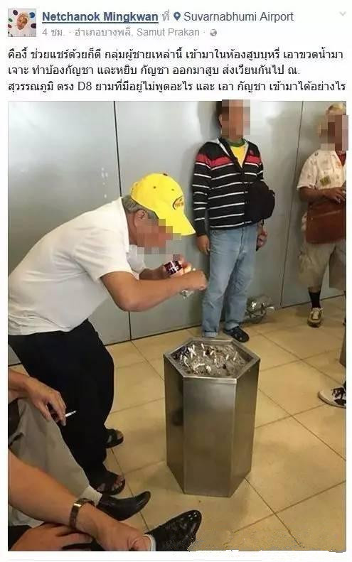 近日,一則“中國游客在泰國國際機(jī)場內(nèi)吸食大麻,安保人員放任不管”的消息在泰國臉書上引發(fā)網(wǎng)友熱烈討論,發(fā)帖人Netchanok Mingkwan女士稱,她在泰國曼谷素萬那普國際機(jī)場D8候機(jī)區(qū)域的吸煙室,看到一個中國旅游團(tuán)的大爺,把大麻放在一個經(jīng)過改裝,戳有氣孔的塑料瓶子上點(diǎn)燃并吸食,搞得里面烏煙瘴氣,她質(zhì)疑中國游客如何將大麻帶入泰國境內(nèi)。