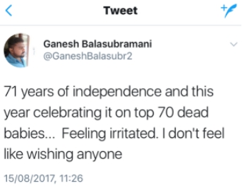 網(wǎng)友@Ganesh Balssubramani:用70個(gè)孩子的死亡紀(jì)念國家獨(dú)立······我感到很憤怒,不想祝福任何人。