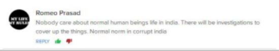 網(wǎng)友@Romeo Prasad:在印度,沒有人關(guān)注普通人的生死。所謂的調(diào)查只不過是為了將此事掩蓋。這種事情在腐敗的印度是再正常不過。