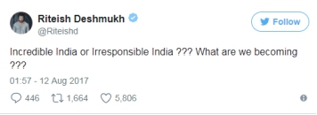 無怪乎寶萊塢男演員里提什·德什穆克在社交網(wǎng)站上這樣寫道:“不可思議的印度還是不負(fù)責(zé)任的印度???我們變成了什么???”