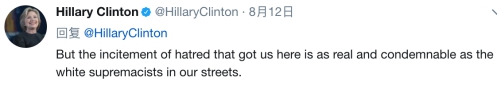 不只奧巴馬,美國前國務卿希拉里也發(fā)表推文說:“煽動種族仇恨的人應該和游行的白人至上主義者一樣受到懲罰!