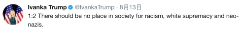 特朗普的女兒伊萬卡,對此事的態(tài)度也十分鮮明。她通過社交媒體言辭激烈地譴責“種族歧視、白人至上主義和新納粹”。她表示,這些思想在美國社會沒有存在空間。