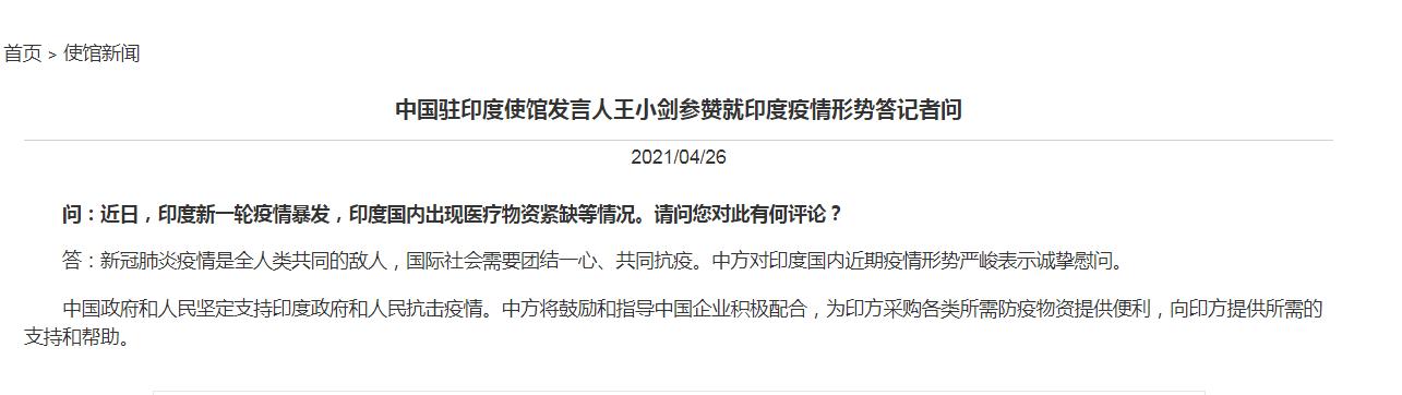 26日,中國駐印度使館發(fā)言人王小劍參贊就印度疫情形勢答記者問。