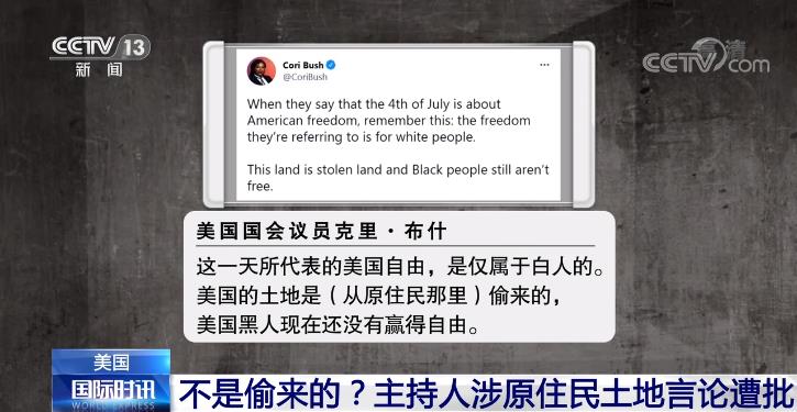 ?怂剐侣勁_主持人杰西·沃特斯之所以這么說,是因為在7月4日美國獨立日當(dāng)天,美國國會議員、非洲裔社會活動家克里·布什發(fā)布了一條推文,她寫道:“這一天所代表的美國自由,是僅屬于白人的。美國的土地是從原住民那里偷來的,美國黑人現(xiàn)在還沒有贏得自由!