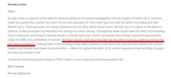 △比約克曼在發(fā)給自媒體播客節(jié)目“本周病毒學(xué)”的信中寫道,“我也許太天真了,沒想到這封信會(huì)被用來推廣‘實(shí)驗(yàn)室起源’假說”。