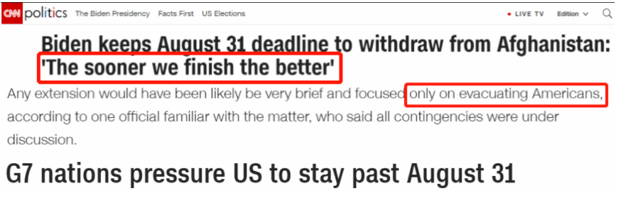 “按計劃”的潛臺詞就是8月31日前美軍將撤離阿富汗。而此前,七國集團(tuán)(G7)領(lǐng)導(dǎo)人阿富汗問題特別會議上,以英國首相約翰遜為首的G7領(lǐng)導(dǎo)人敦促拜登延長最后期限,因?yàn)樾枰鄷r間來疏散他們的公民。