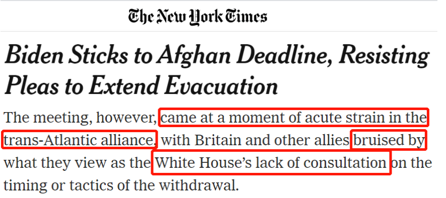 △《紐約時報》報道中說,此次G7會議在跨大西洋同盟關(guān)系處于緊張的時刻召開,英國等其他盟友因美方缺乏與其在撤軍時間和策略上的協(xié)商而倍感挫折。
