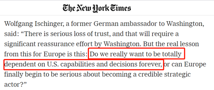 △德國前駐美大使沃爾夫?qū)ひ辽旮駹柋硎,“對歐洲來說,真正的教訓(xùn)是“我們真的想永遠(yuǎn)完全依賴美國的能力和決策嗎?”
