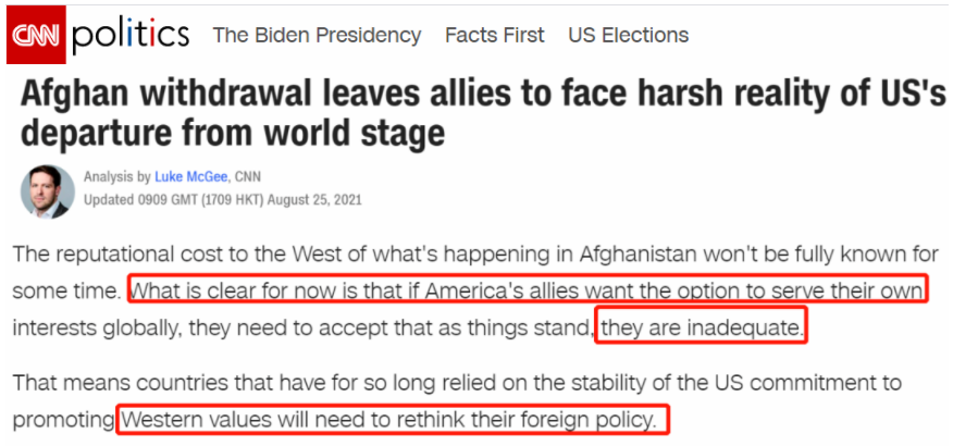 但對這些盟友來說,現(xiàn)在有更清楚的事實(shí)擺在眼前,那就是:如果他們想要為自己的利益服務(wù),就目前的情況來看,他們的能力是不夠的。這正是美國有線電視新聞網(wǎng)(CNN)在《阿富汗撤軍使盟國面臨美國退出世界舞臺的嚴(yán)酷現(xiàn)實(shí)》一文中指出的觀點(diǎn)。文章還認(rèn)為,那些長期依賴美國承諾的穩(wěn)定來推動西方價值觀的國家,將需要重新思考自己的外交政策。