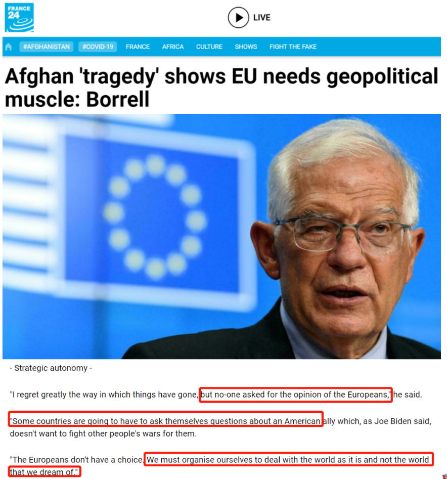 △法國國際新聞頻道“法蘭西24”報道截圖。博雷利表示,“阿富汗喚醒了歐洲的危機(jī)意識”,他“將提議為歐盟組建一支5萬人的強(qiáng)大遠(yuǎn)征軍,防止再次發(fā)生類似阿富汗的情況”。
