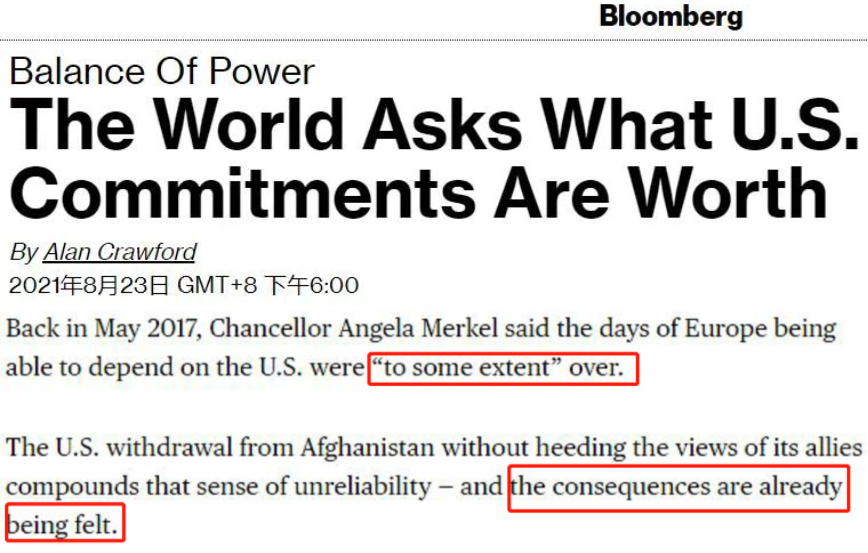 △彭博社:《全世界都在問美國的承諾值多少錢》:早在2017年5月特朗普上臺后不久,德國總理安格拉·默克爾(Angela Merkel)就表示,歐洲能夠依賴美國的日子“在某種程度上”已經(jīng)結(jié)束。美國在不聽取盟友意見的情況下從阿富汗撤軍,加劇了這種不信任感。