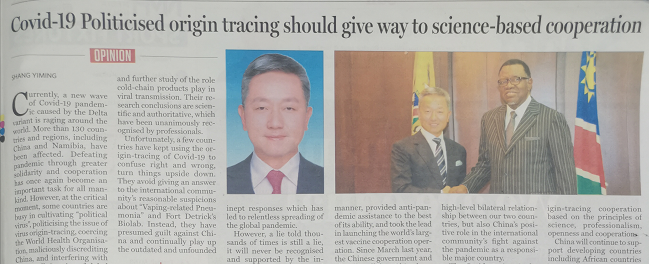 中國(guó)駐納米比亞大使在納主流媒體發(fā)文:病毒溯源不應(yīng)被政治化、污名化、工具化