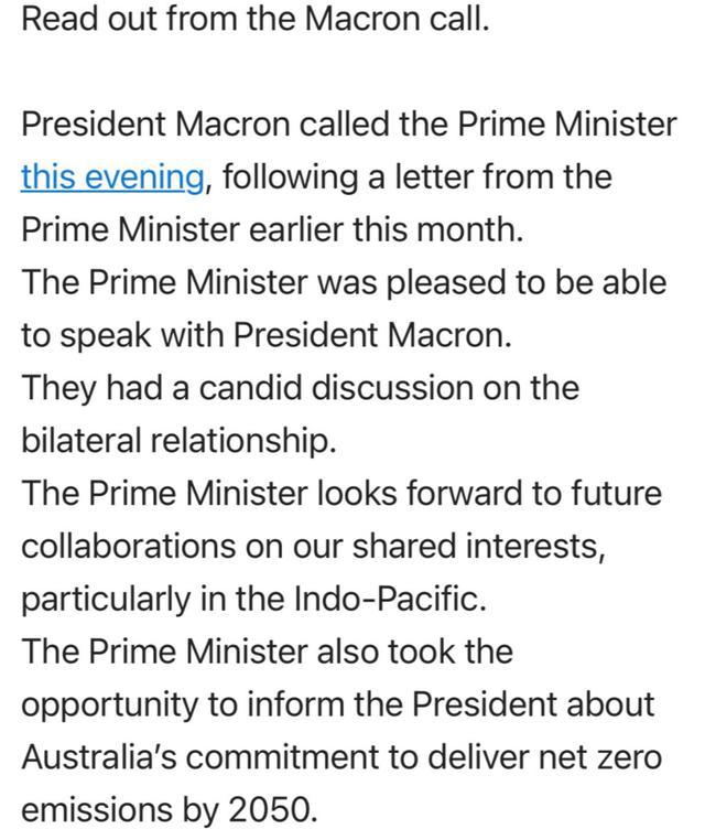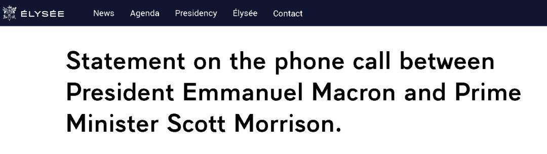 其中,澳大利亞政府發(fā)布的關(guān)于兩國領(lǐng)導人通話的聲明十分簡短,大意是澳方稱莫里森總理和馬克龍總統(tǒng)就雙邊關(guān)系進行了“坦率”的交流,莫里森“期待”與法方在印度太平洋地區(qū)等雙方有著共同利益的事務上繼續(xù)合作。
