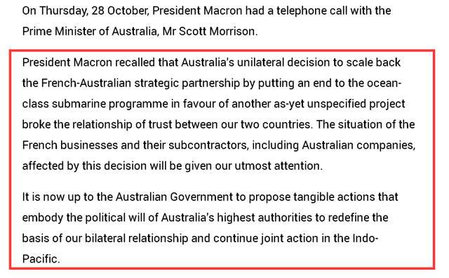 如下圖所示,在法國總統(tǒng)府發(fā)布的雙方通話聲明中,法方一上來就再次吐槽了澳大利亞之前在潛艇問題上背叛法國的舉動,稱這一行為損害了雙方的互信和雙方企業(yè)的利益,并稱澳方應該為重新建立起兩國在印太地區(qū)的合作和雙邊關(guān)系而拿出誠意。