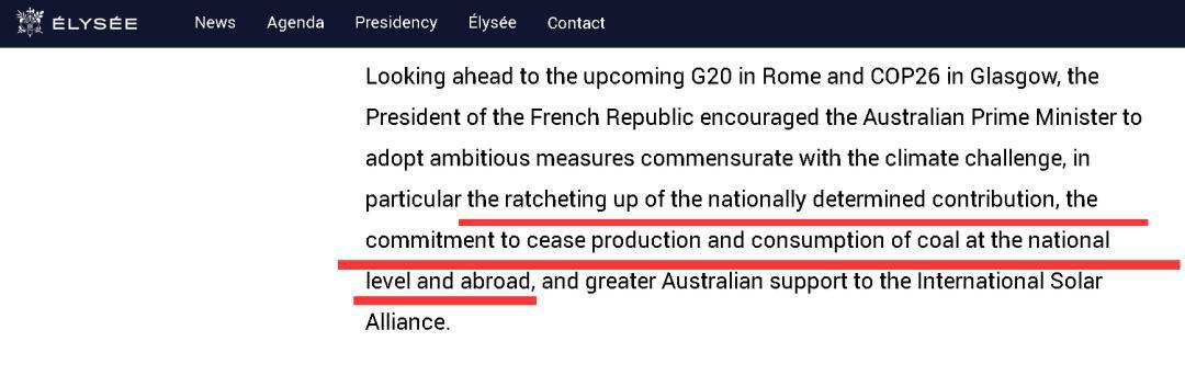 而在涉及氣候變化的部分,法方的說法也同樣讓莫里森頗為難堪,因為從措辭來看,法方似乎是覺得澳大利亞在應對氣候變化問題上不應該光有承諾,還應該付諸于行動,并尤其提到了澳方應該致力于減少煤炭的生產(chǎn)和使用。