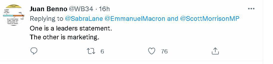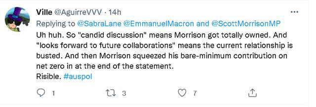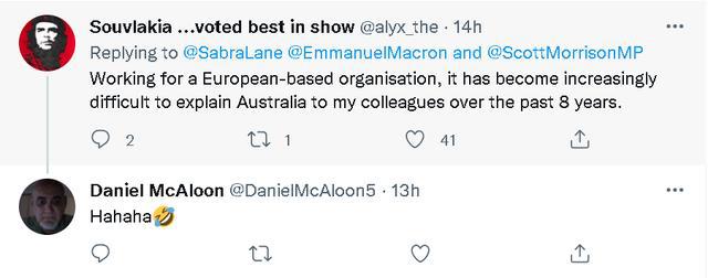 總之,當法方這份馬克龍在通話中對莫里森一陣數(shù)落和諷刺的聲明發(fā)布后,不少澳大利亞網(wǎng)民都覺得很尷尬。一些本身就很反感莫里森的網(wǎng)民還諷刺起了莫里森,稱他為了自己的政治利益歪曲通話內(nèi)容,并認為法國對澳大利亞的抨擊很有道理。