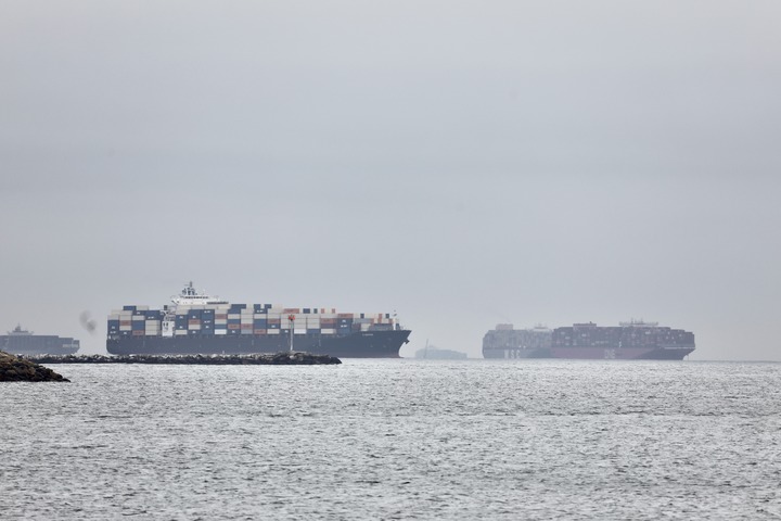 這是10月22日拍攝的在美國加利福尼亞州洛杉磯附近海域等待卸貨的集裝箱貨輪。新華社發(fā)