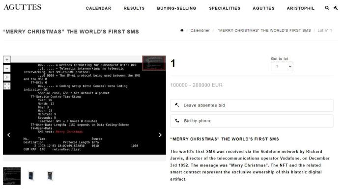 這條具有里程碑意義的短信,將以數(shù)字復(fù)制品的形式,在12月21日于巴黎被拍賣(mài)。承擔(dān)此次拍賣(mài)的法國(guó)阿古特(Aguttes)拍賣(mài)行目前已經(jīng)將該商品掛在其網(wǎng)站上,并為其預(yù)估了成交價(jià),預(yù)計(jì)為10萬(wàn)至20萬(wàn)歐元。