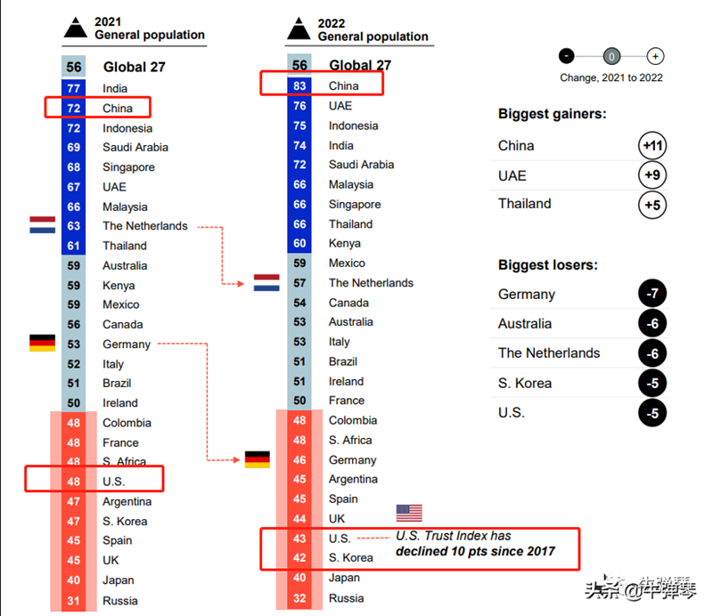 2021年是世界第二,但一年過(guò)去了,中國(guó)得分整整增加了11個(gè)百分點(diǎn),是唯一一個(gè)信任度超過(guò)80%的國(guó)家。