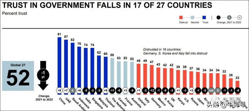 我們?cè)倏匆幌旅绹?guó),2021年信任度是48%,2022年是43%,又跌了5個(gè)百分點(diǎn)。按照?qǐng)?bào)告的說(shuō)法,自2017年,美國(guó)人對(duì)國(guó)家的信任度跌了整整10個(gè)百分點(diǎn)。