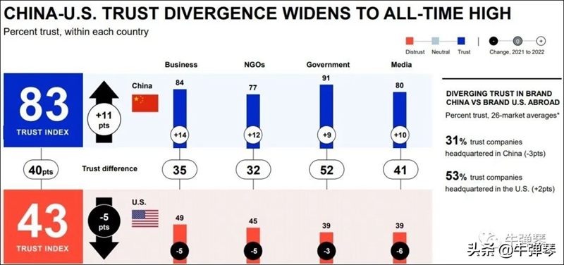 很有意思的是,這份報(bào)告還特意搞了一個(gè)中美信任度對(duì)比。