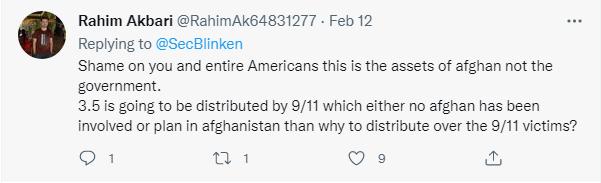 網(wǎng)友Rahim Akbari在美國國務(wù)卿布林肯推特賬號下評論,“為你(布林肯)和所有美國人民感到羞恥,這是阿富汗人的資產(chǎn),不是政府的。阿富汗人沒有參與‘911',為什么要把他們的35億資產(chǎn)分配給‘911'的受害者”?