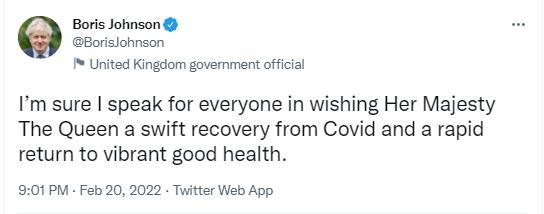 20日,英國(guó)女王新冠陽(yáng)性,英國(guó)首相約翰遜在社交媒體發(fā)文祝愿她早日康復(fù)。圖片來(lái)源:英國(guó)首相社交媒體官方賬號(hào)截圖。