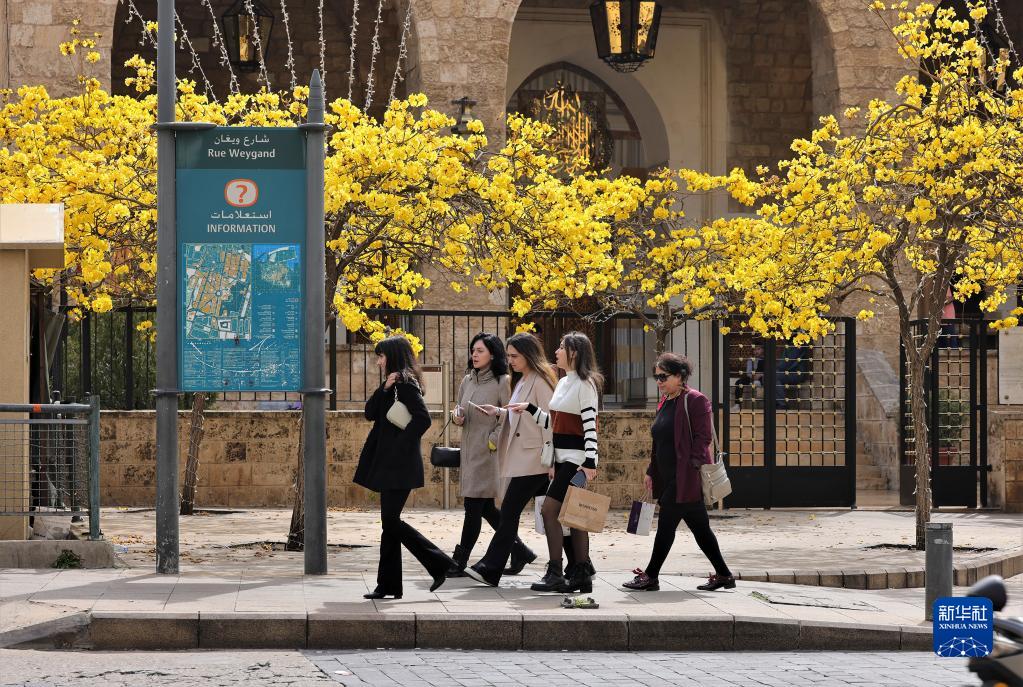 3月31日,在黎巴嫩貝魯特,人們從盛開的黃花風(fēng)鈴木旁走過。