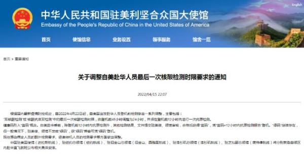 4月15日,中國(guó)駐美國(guó)大使館表示,自當(dāng)?shù)貢r(shí)間4月22日起,對(duì)自美國(guó)出發(fā)赴華人員登機(jī)前檢測(cè)做出一系列調(diào)整, “雙核酸檢測(cè)”或“核酸抗體雙檢測(cè)”中的最后一次核酸檢測(cè)時(shí)限,由登機(jī)前48小時(shí)內(nèi)調(diào)整為24小時(shí)內(nèi),并須在登機(jī)前12小時(shí)內(nèi)再進(jìn)行一次抗原檢測(cè)。
