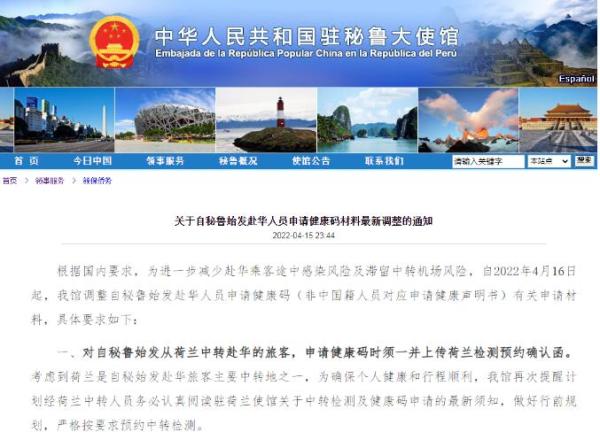 中國(guó)駐秘魯大使館表示,自當(dāng)?shù)貢r(shí)間4月16日起,自秘魯始發(fā)從荷蘭中轉(zhuǎn)赴華的人員,申請(qǐng)健康碼時(shí)須一并上傳荷蘭檢測(cè)預(yù)約確認(rèn)函。