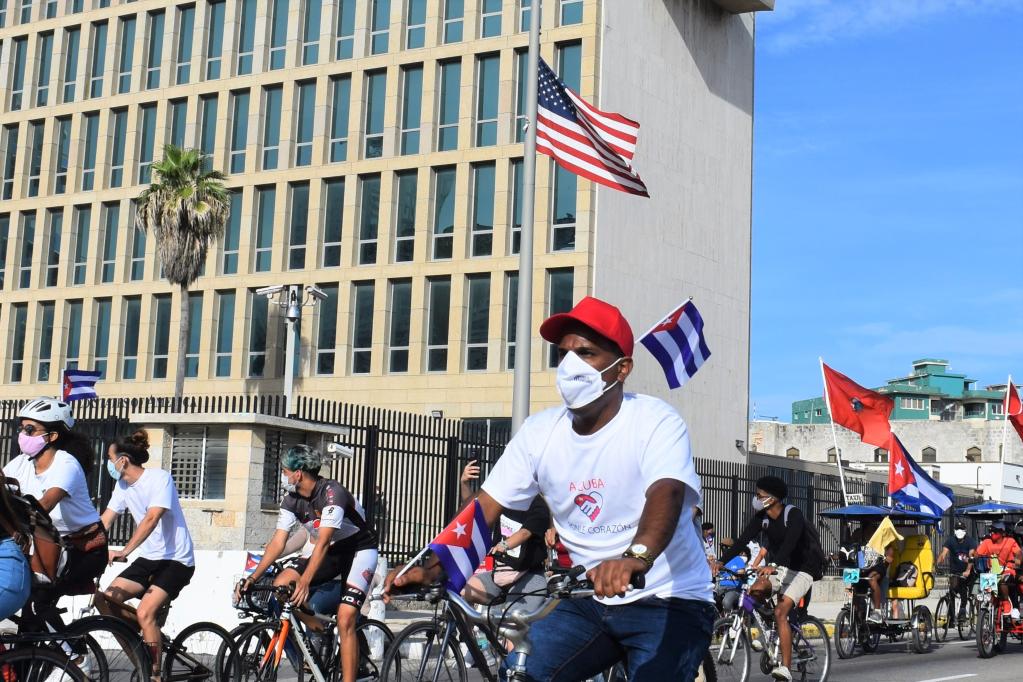 2021年8月5日,在古巴首都哈瓦那,游行隊伍經(jīng)過美國駐古巴大使館。新華社記者朱婉君攝