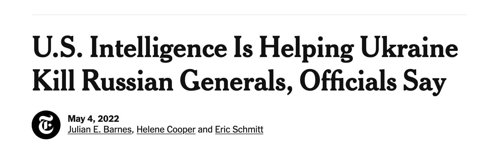“有官員透露,美國情報正在幫助烏克蘭獵殺俄軍將領(lǐng)”。5月4日,《紐約時報》的這則報道,標題直截了當,內(nèi)容吸引眼球。