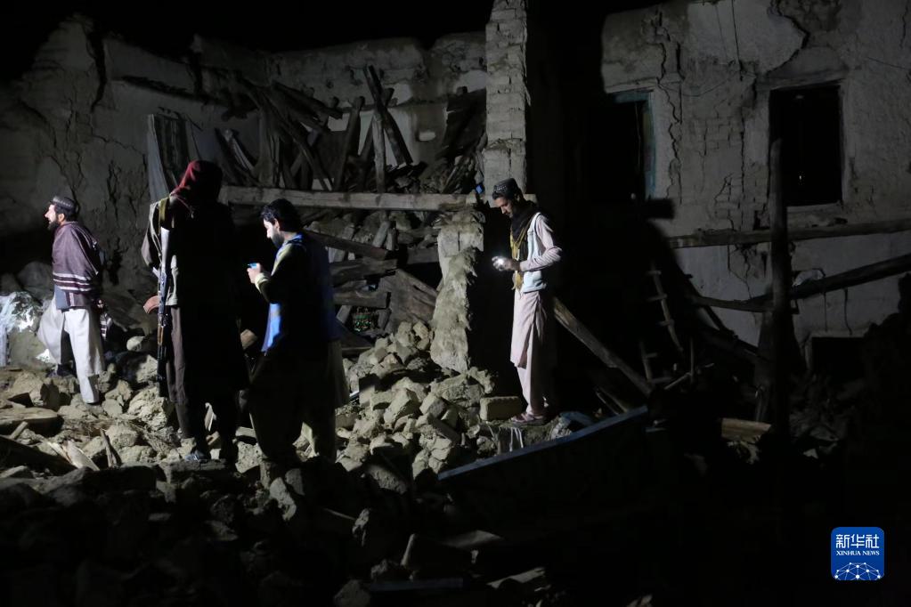 6月22日,在阿富汗東部帕克提卡省的一個(gè)村莊,人們查看地震中受損的房屋。新華社發(fā)(塞夫拉赫曼·薩菲攝)