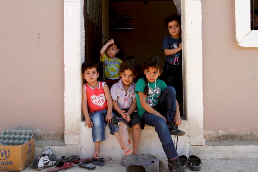 2016年9月1日,在敘利亞首都大馬士革南郊的哈爾杰萊難民營,幾名敘利亞兒童坐在門前。新華社記者 楊臻 攝