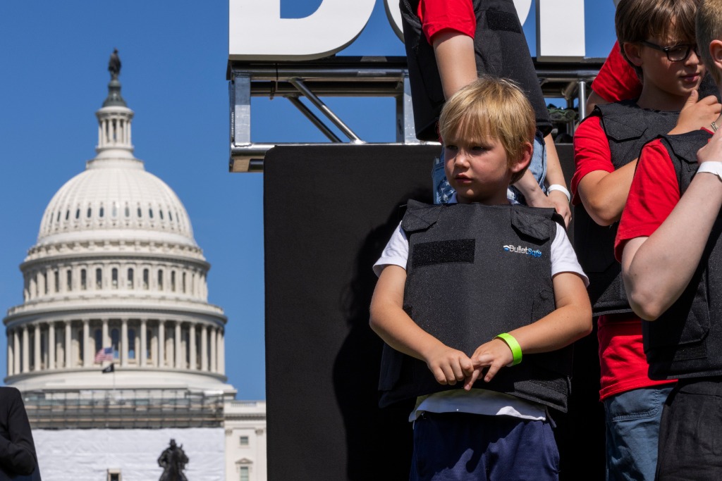 6月6日,學(xué)生們身穿防彈衣在美國華盛頓的國會大廈前參加名為“不要回避”的抗議活動,呼吁立法機(jī)構(gòu)正視美國槍擊案頻發(fā)的社會問題,要求加強(qiáng)槍支管控立法。新華社發(fā)(亞倫攝)