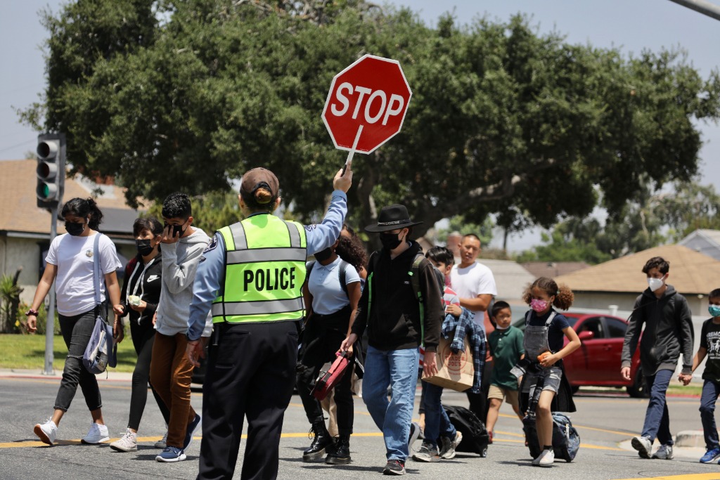 5月25日,一名警員在美國洛杉磯縣一所小學(xué)附近臨時指揮交通,為學(xué)生放學(xué)提供安全保護(hù)。新華社發(fā)