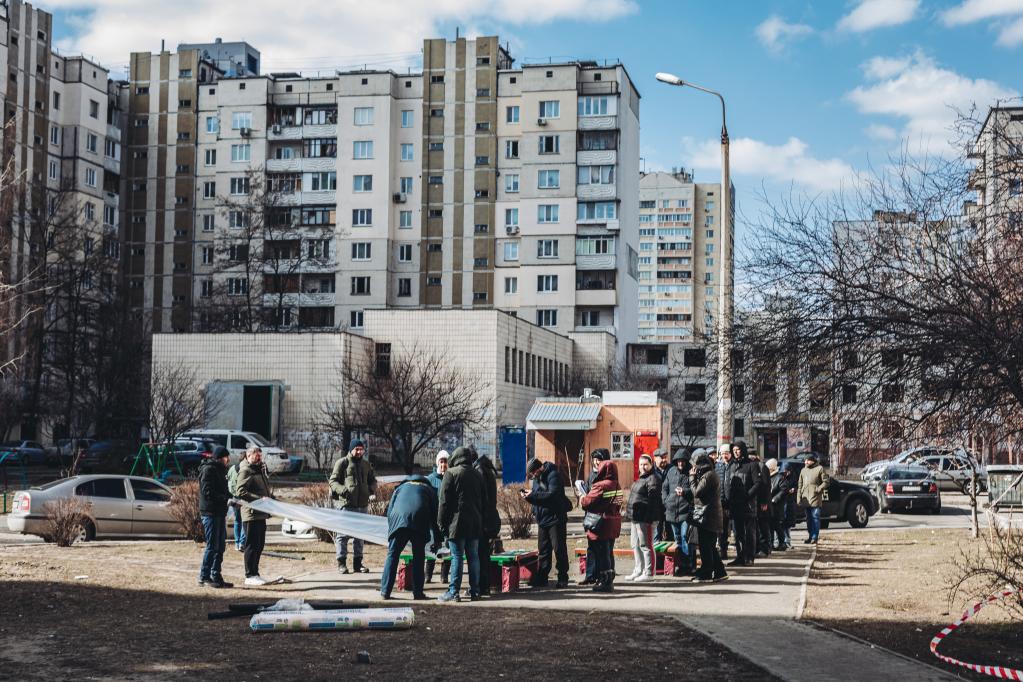 3月17日,人們?cè)跒蹩颂m基輔領(lǐng)取用來遮擋窗戶的塑料布。新華社發(fā)(迭戈·埃雷拉攝)