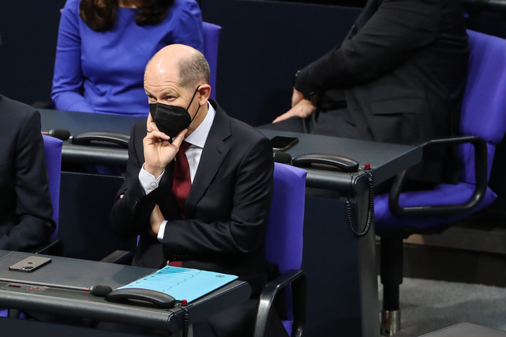 2021年12月8日,在德國(guó)首都柏林的國(guó)會(huì)大廈,朔爾茨出席會(huì)議。新華社記者單宇琦攝