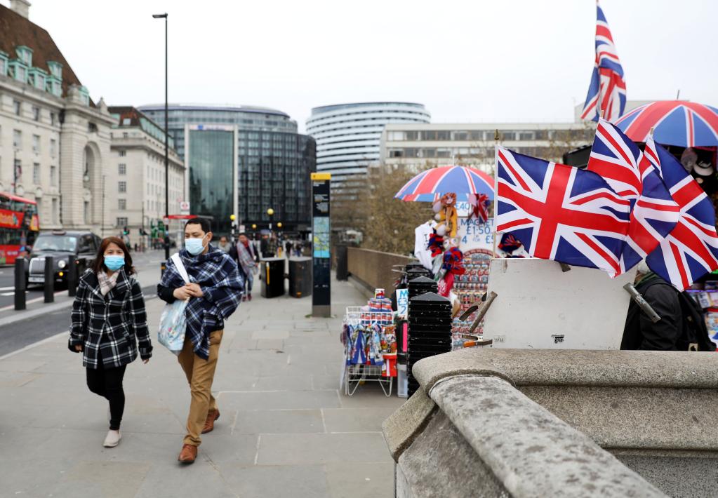 3月27日,在英國倫敦,人們佩戴口罩出行。新華社記者李穎攝