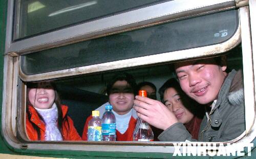 1月31日,幾名乘客登上廣州火車東站開往洛陽(yáng)的列車后露出笑容。 經(jīng)鐵路部門全力調(diào)度,目前京廣鐵路運(yùn)輸秩序正逐步恢復(fù)。鐵道部支援廣鐵集團(tuán)的第一批28列列車1月30日已全部上線運(yùn)行。 新華社記者 壯錦攝