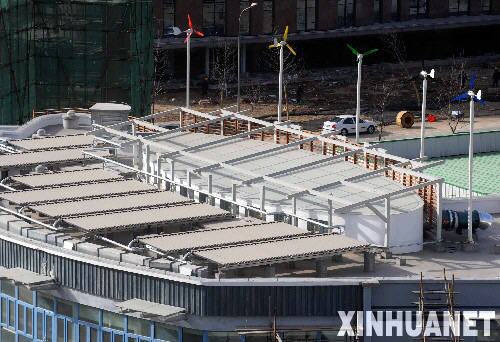 2008年奧運會期間,供各國運動員、教練員等相關人員住宿的奧運村所用的可再生能源利用設備系統(tǒng)將從再生水熱泵冷熱源以及太陽能中獲取789萬千瓦時的能量用于空調制冷和生活熱水,節(jié)約標煤3077噸,相當于減排二氧化碳8000噸。圖為2月28日拍攝的安裝在奧運村內屋頂上的風力發(fā)電機。 新華社記者羅曉光攝