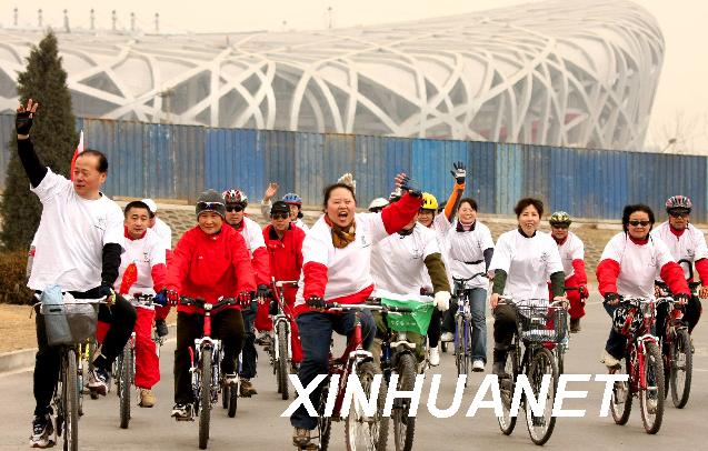 3月1日,自行車愛好者到達(dá)國家體育場“鳥巢”。當(dāng)日,來自北京市各區(qū)縣的500多名自行車愛好者在北京市自行車運(yùn)動協(xié)會的組織下,從先農(nóng)壇體育場出發(fā),參加“綠色騎行”活動。新華社發(fā)(李慧 攝)