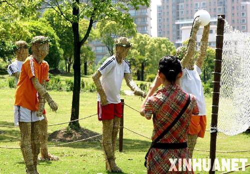 5月7日,一名游客正在拍攝“打排球”的稻草人。 近日,名為“草地上的奧運(yùn)會”稻草人置景亮相上海浦東世紀(jì)公園,游客們在欣賞大好春光的同時也感受到濃厚的奧運(yùn)氣息。 新華社記者 劉穎 攝