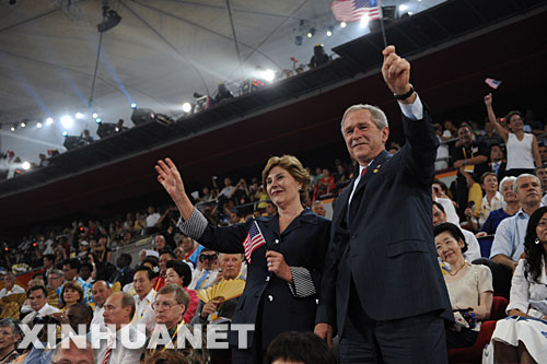8月8日,美國(guó)總統(tǒng)布什和夫人在北京奧運(yùn)會(huì)開(kāi)幕式上向運(yùn)動(dòng)員致意。新華社記者趙鵬 攝